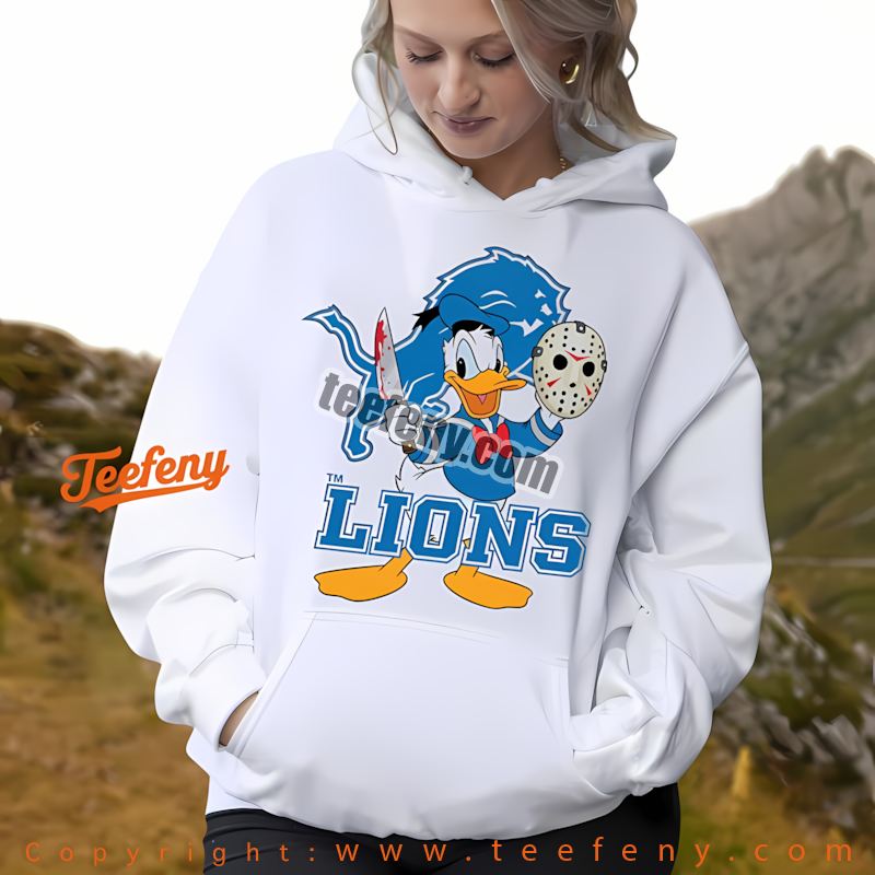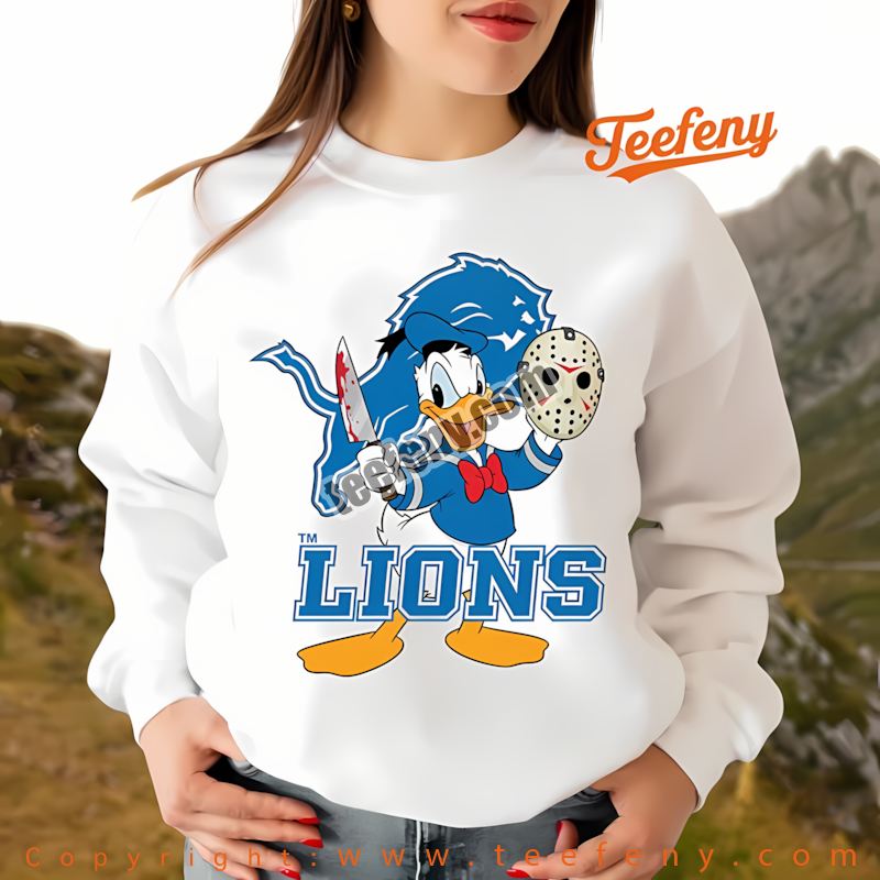 Looking to stand out this season? The Detroit Lions Donald Duck Jason Mask Halloween Shirt Holiday combines your love for sports and playful pop culture in a unique way. Inspired by the fierce spirit of the Detroit Lions and the whimsical charm of Donald Duck, this shirt is perfect for fans searching for that one-of-a-kind addition to their NFL Detroit Lions Halloween clothing collection.