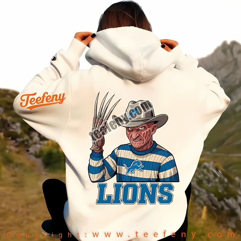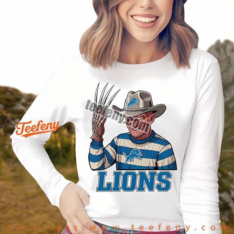 Featuring vibrant, high-quality prints, this Freddy Krueger Lions apparel stands out in any crowd. Our advanced printing technology guarantees that the graphic won’t fade, ensuring your shirt remains a staple in your closet for many seasons of spirited support. With a design that captures the essence of autumn nights and football excitement, this tee is not just clothing; it’s an expression of your fandom.