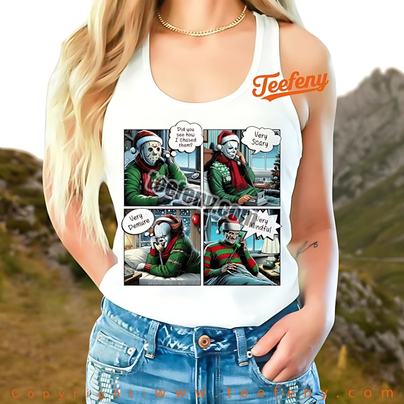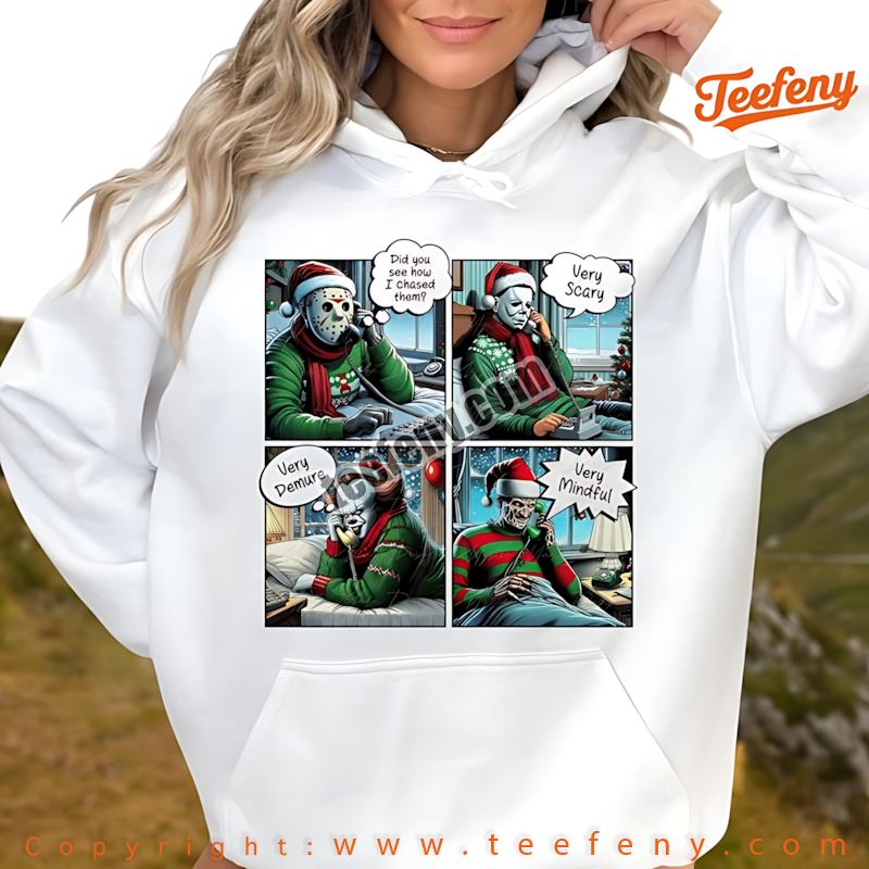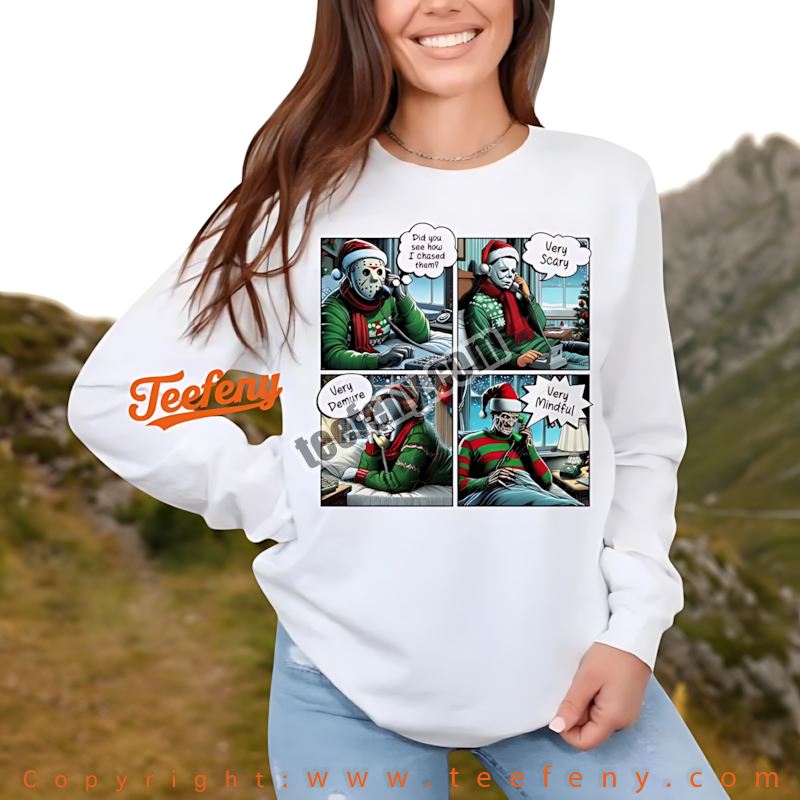 This Horror Christmas Shirt Slasher Characters On Phone Funny Parody combines the spooky thrill of iconic slasher characters with a festive twist. Perfect for those who love blending humor with holiday cheer, this unique design showcases a delightful clash of horror and joy. Show your love for both Halloween festivities and Christmas cheer with this captivating piece.