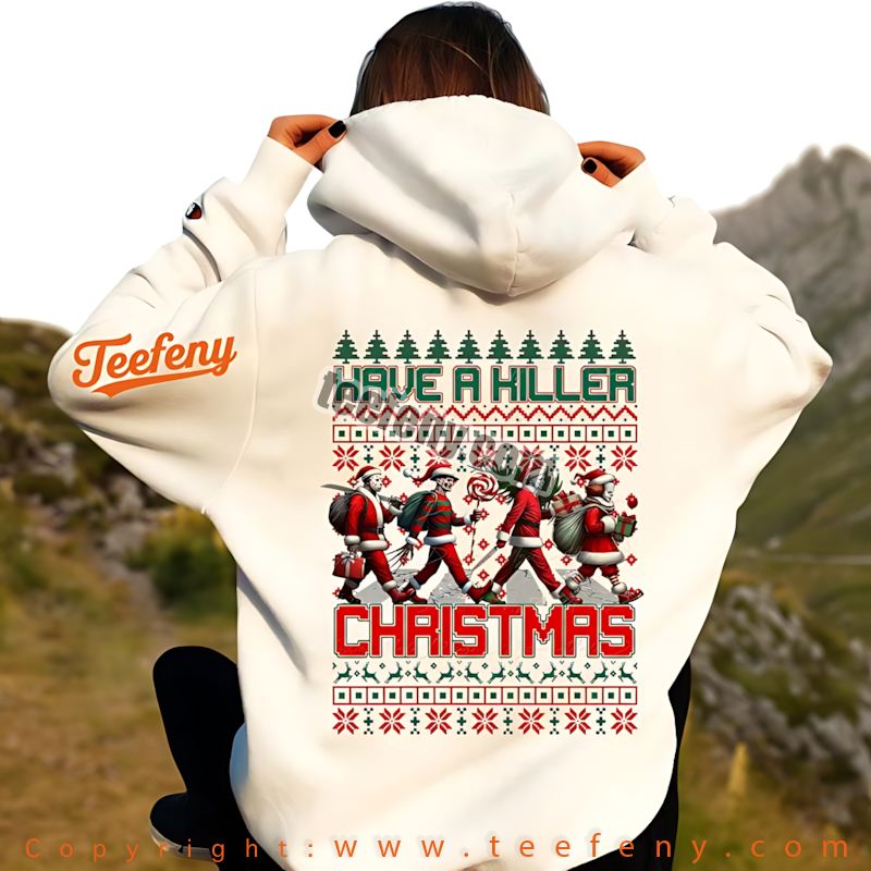 Originating from a love of unconventional holiday cheer, this shirt is perfect for fans of both Christmas and horror genres alike. The quirky mash-up celebrates the magic of the season while paying homage to classic slasher films, proving that Ugly Christmas Sweater styles can have a thrilling twist. Teefeny puts a creative spin on your holiday wardrobe, making each piece a conversation starter among friends and families.