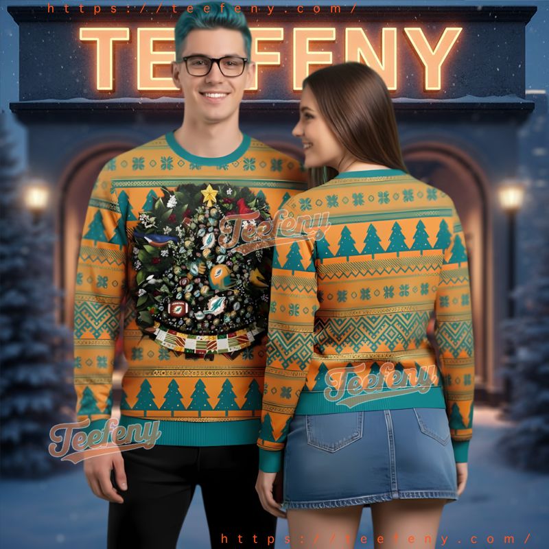 Don’t miss out on this delightful statement piece—ideal for fellow fans or as a memorable gift for loved ones. Make a bold statement and show your team spirit with the Miami Dolphins Logo Decorated Tree Ugly Christmas Sweater. Elevate your holiday wardrobe and embrace the season in style!
