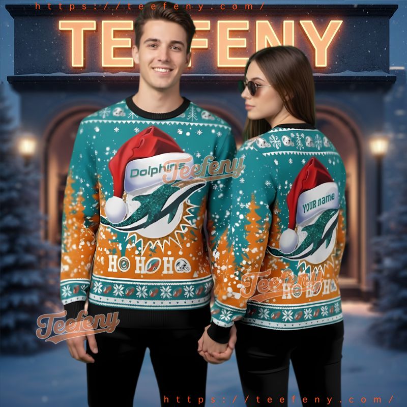 Don’t miss out on this must-have accessory for any Dolphins fan! Whether for yourself or as a thoughtful gift for a loved one, the Miami Dolphins Personalized Santa Hat Ugly Christmas Sweater is the ultimate way to celebrate the season. Grab yours today and be the life of the party while showcasing your dedication with this ugly Christmas sweater!