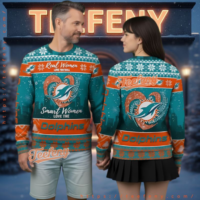 Show off your Miami Dolphins pride this holiday season with the Miami Dolphins Real Smart Women Love Ugly Christmas Sweater. This unique design celebrates the spirit of fandom while adding a fun twist to your festive wardrobe. Embrace the holiday cheer with a touch of team loyalty that stands out in any gathering.