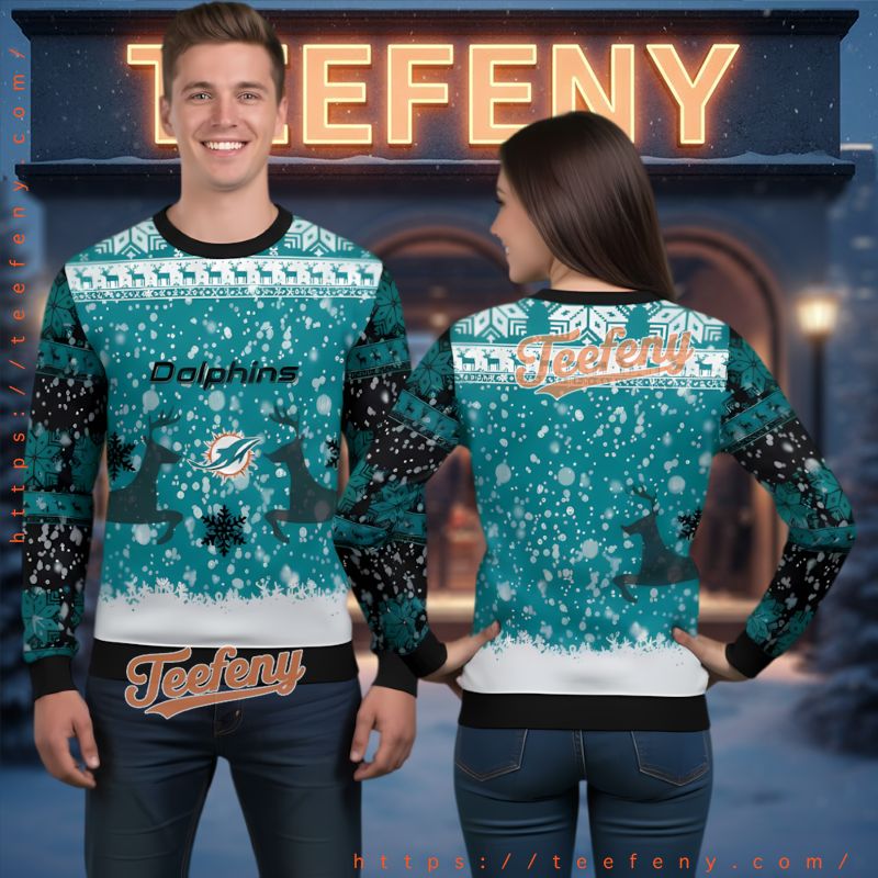 Comfort is key, especially during the festive season. The Miami Dolphins Snowfall Reindeer Ugly Christmas Sweater from Teefeny ensures that you feel as cozy as you look. Made from high-quality polyester, this sweater offers both versatility and warmth, making it an ideal choice for holiday parties or casual family gatherings, embodying the spirit of a comfortable Christmas outfit.