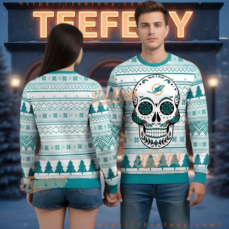 This Miami Dolphins Sugar Skull Ugly Christmas Sweater Flower is the perfect gift for any fan looking to add some flair to their holiday attire. Make a bold statement with this must-have apparel, showcasing your love for the Dolphins. Don’t miss out on the chance to own this one-of-a-kind piece—order your Miami Dolphins Sugar Skull Ugly Christmas Sweater Flower today!