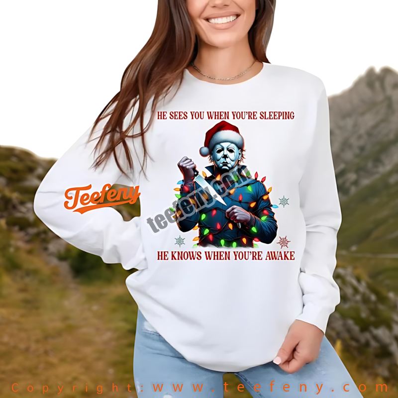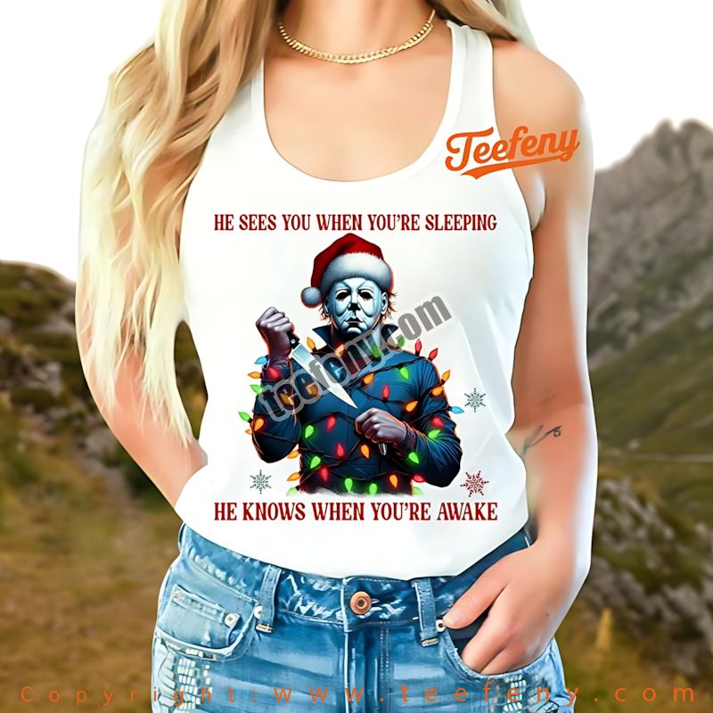 Don’t miss out on this must-have apparel for horror fans. Gift it to friends or keep it for yourself to showcase your love of the season and the franchise. Add the Michael Myers Lights Shirt Christmas Horror Sleeping Awake Quote to your collection, and enjoy a festive twist on a classic horror theme!
