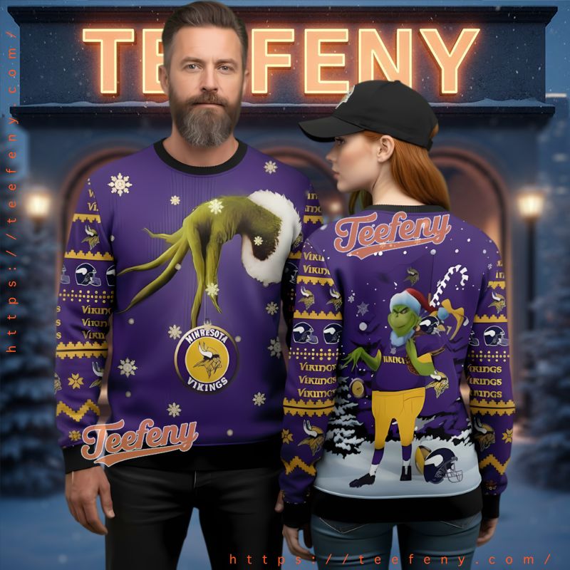 Embrace the holiday vibes with the engaging screen print and laugh-out-loud design of the Minnesota Vikings Grinch Hand Ornament Ugly Christmas Sweater Purple. It’s not just an apparel piece; it’s a necessity for every fan. Make this ugly Christmas sweater your go-to for celebrations, and give it as a gift to fellow Vikings fans who need a touch of festive flair this season!