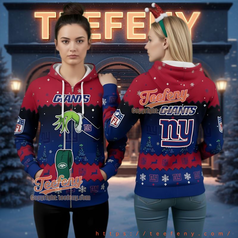 Don’t miss your chance to own this must-have holiday apparel. Show everyone that you’re a true fan with the New York Giants Grinchmas Jets Fan Ugly Christmas 3D Hoodie. It’s the ultimate way to celebrate the season and express your team spirit!