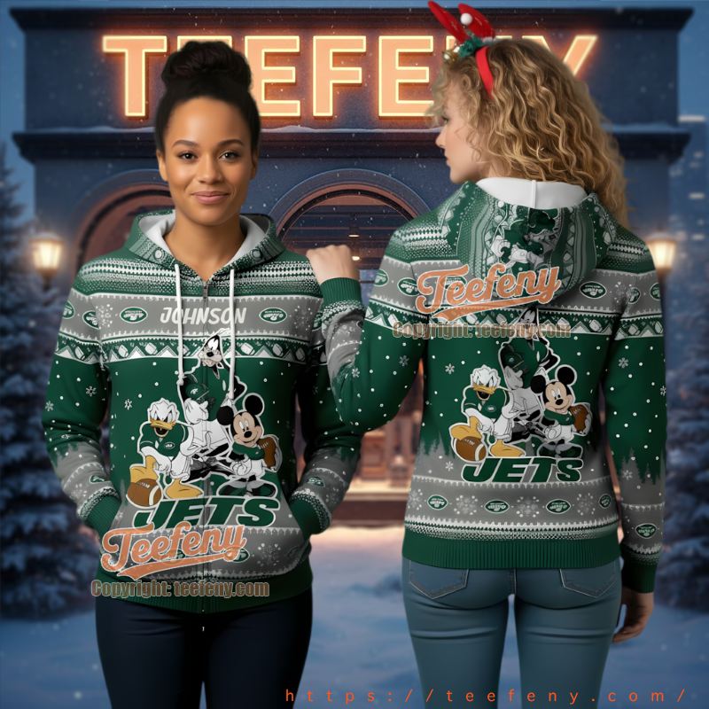 Product information "New York Jets Mickey Donald Goofy Ugly Christmas 3D Zip Up Hoodie Custom"