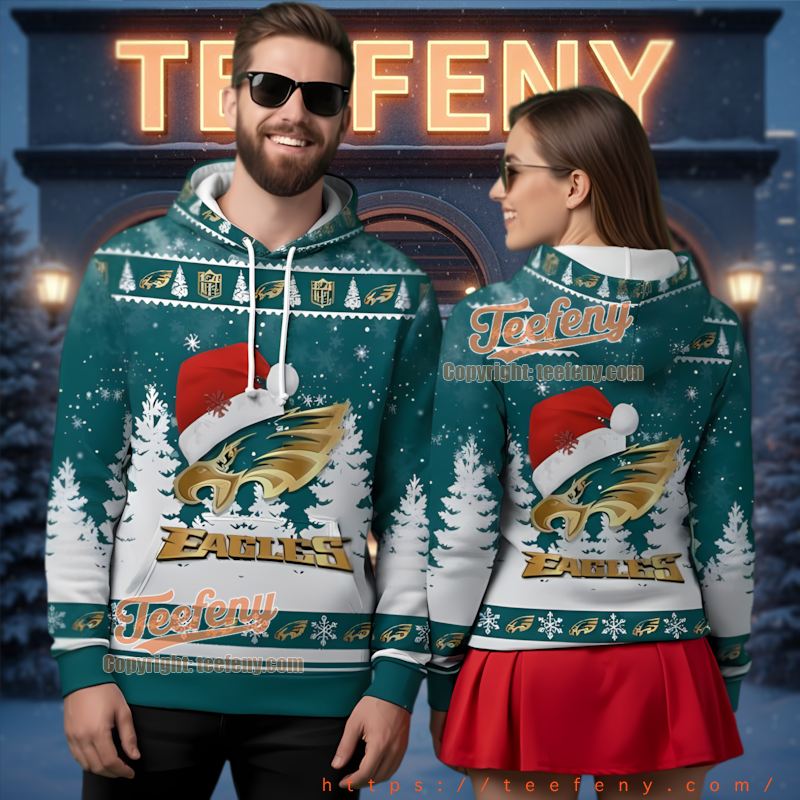Don’t miss out on the chance to own this must-have fan apparel. The Philadelphia Eagles Gold Logo 3D Ugly Christmas Hoodie Santa Hat makes for a delightful gift for any Eagles supporter. Elevate your holiday wardrobe and showcase your love for the team with this unique piece that encapsulates team spirit and festive cheer!