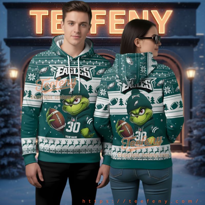 Introducing the Philadelphia Eagles Grinch Football Ugly Christmas 3D Hoodie, a perfect blend of holiday cheer and fan pride. This unique design captures the whimsical spirit of the season while showcasing your love for the Eagles in a fun way. Stand out at any gathering with this eye-catching piece that will have everyone talking about your festive enthusiasm.