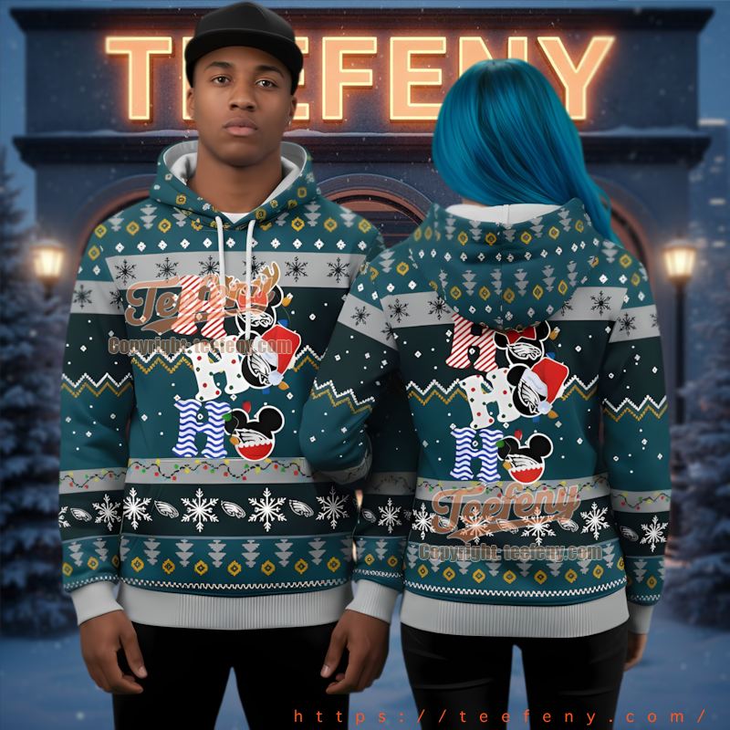 Teefeny has a strong connection to fandom, drawing inspiration from beloved characters and sports teams. Creating a piece like this reminds fans of cherished moments spent with friends and family, cheering on the Eagles during crucial games. This Eagles Mickey Mouse hoodie will become a nostalgic item for fans, celebrating both their football loyalty and holiday vibe.
