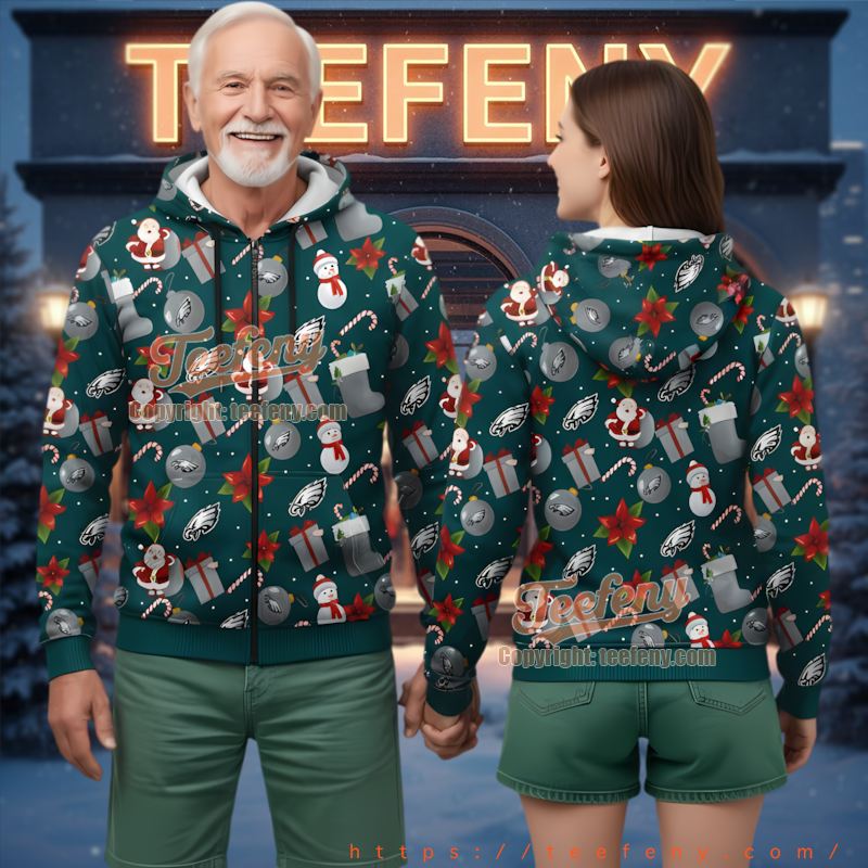 Don’t miss out on this must-have apparel for Eagles fans everywhere! Grab the Philadelphia Eagles Santa Snowman Ugly Christmas 3D Zip Up Hoodie today, and show off your team pride in style. It’s the ideal fan collectible, perfect for gifting or treating yourself this holiday season!