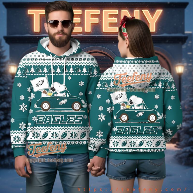 Get into the holiday spirit with the Philadelphia Eagles Snoopy Car Christmas 3D Ugly Hoodie Peanuts Fan. This unique design combines the playful charm of Peanuts with the excitement of football, making it a perfect expression of your team pride. Showcasing your love for both the Eagles and the festive season, this hoodie is sure to spread joy.