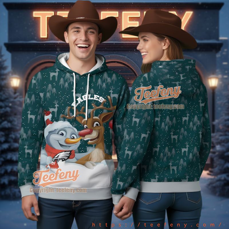 Embrace the holiday spirit with the Philadelphia Eagles Snowman Reindeer Ugly Christmas 3D Hoodie. This cozy apparel combines whimsical design and festive cheer, making it the perfect addition to your winter wardrobe. Ideal for cheering on your team during the holidays, this hoodie transforms any gathering into a fun-filled celebration.