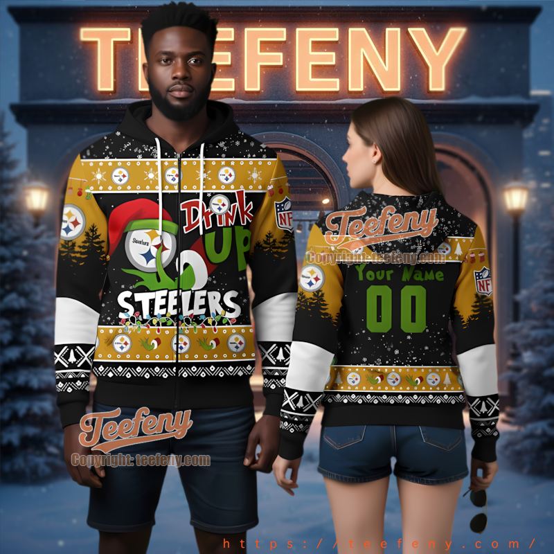 Don’t miss out on the chance to grab your Pittsburgh Steelers Grinch Drink Up Ugly Christmas 3D Hoodie Personalized this holiday season. Whether it’s a gift for a loved one or a treat for yourself, this hoodie is a must-have for any true Steelers enthusiast. Celebrate the holidays in style with this essential piece!