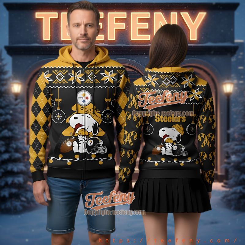 Celebrate the holiday season with the Pittsburgh Steelers Peanuts Snoopy Christmas Tree Full Zip Hoodie, a delightful blend of fun and fandom. This charming hoodie showcases the beloved Peanuts characters nestled among festive decorations, merging sports passion with holiday cheer. It’s the perfect piece for Steelers aficionados who love to spread joy and team spirit.